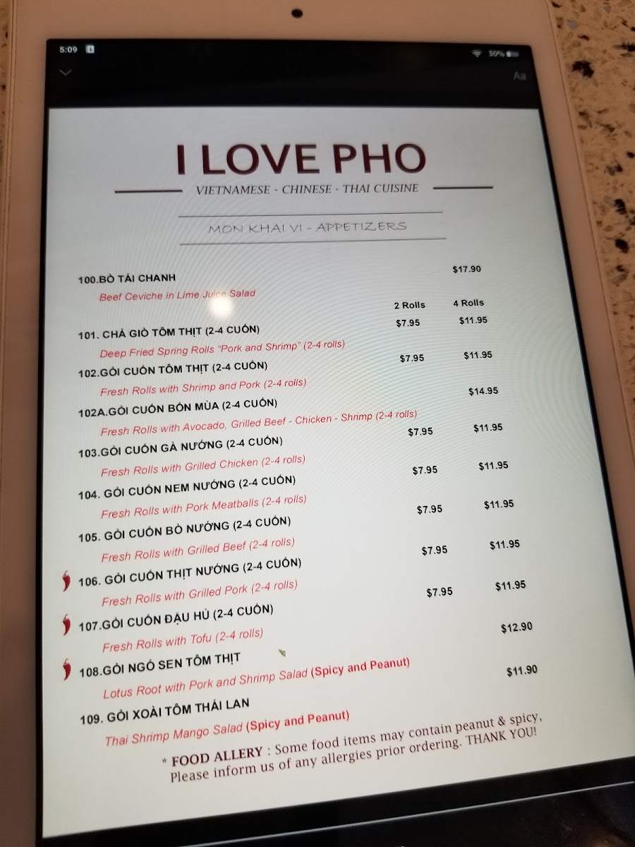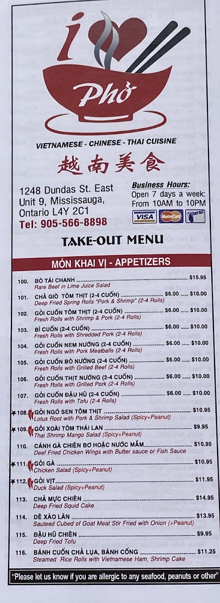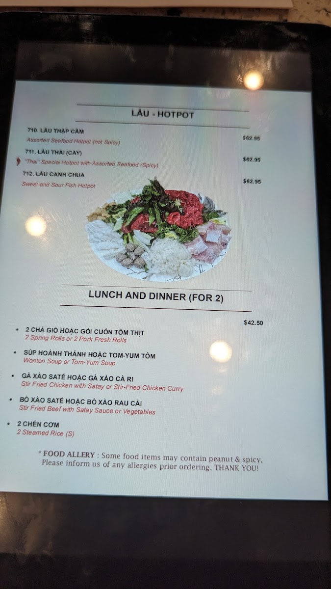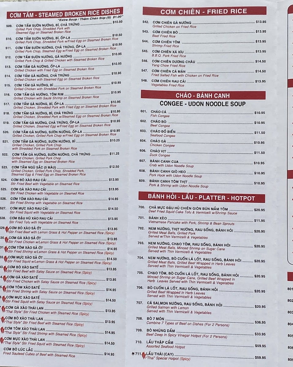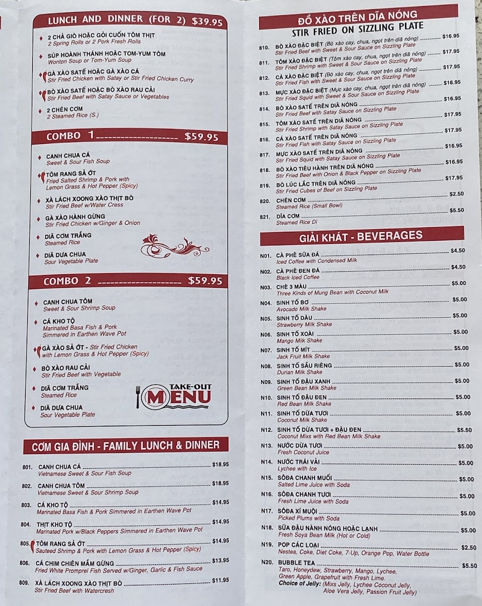 Some items may contain peanuts and spicy ingredients, and guests are advised to inform the staff of any allergies prior to ordering. The menu accommodates casual dining occasions ranging from family lunches and dinners to casual meals for individuals or groups seeking diverse Vietnamese and Asian cuisine options.